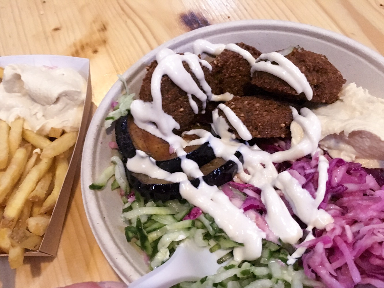 I walked back towards Nyhavn and then across the bridge to the Copenhagen Street Food market. I absolutely loved this place! It doesn’t have as many vegetarian options as I had hoped, but you can always find a good falafel at a food market and I wasn’t disappointed. I got a giant falafel salad bowl and chips for 100kr, which is expensive but I wasn’t surprised by the high prices – Copenhagen is expensive!